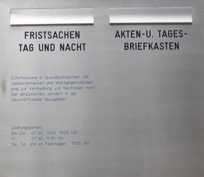Der Nachtbriefkasten befindet sich rechts am Haupteingang des Amtsgerichts (Neubau). Er trägt die Aufschrift "Fristsachen Tag und Nacht"